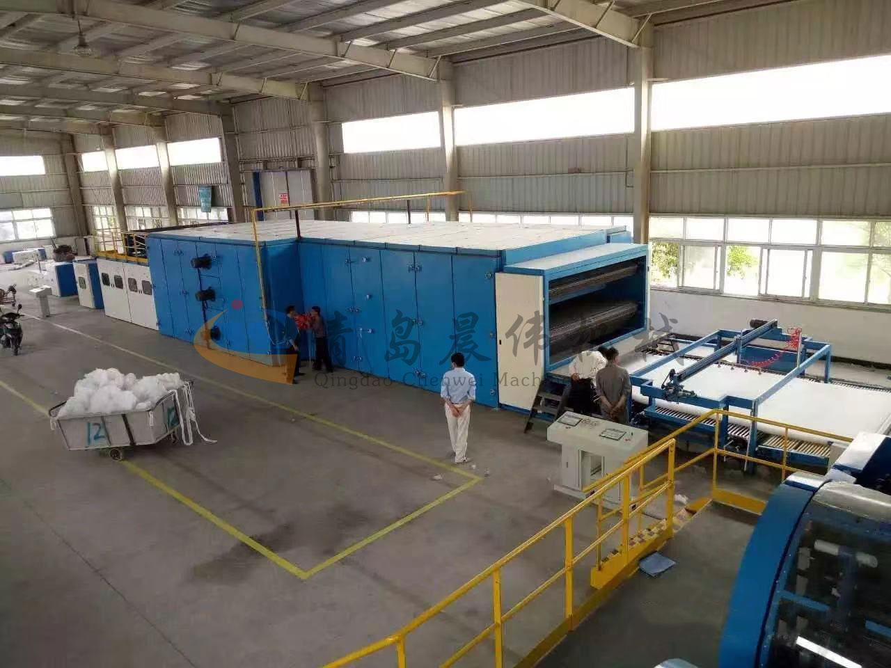 開(kāi)包機(jī)-開(kāi)松機(jī)-振動(dòng)給棉機(jī)-梳理機(jī)-鋪網(wǎng)機(jī)-烘房-燙光機(jī)-成卷切片機(jī)